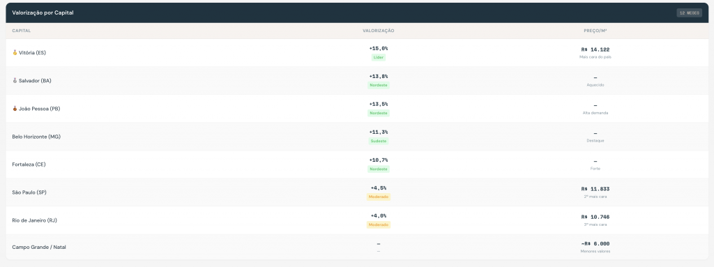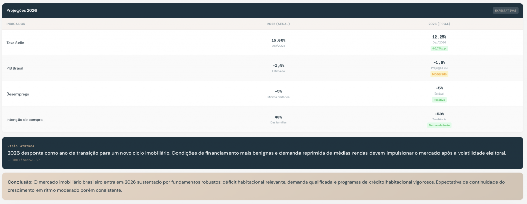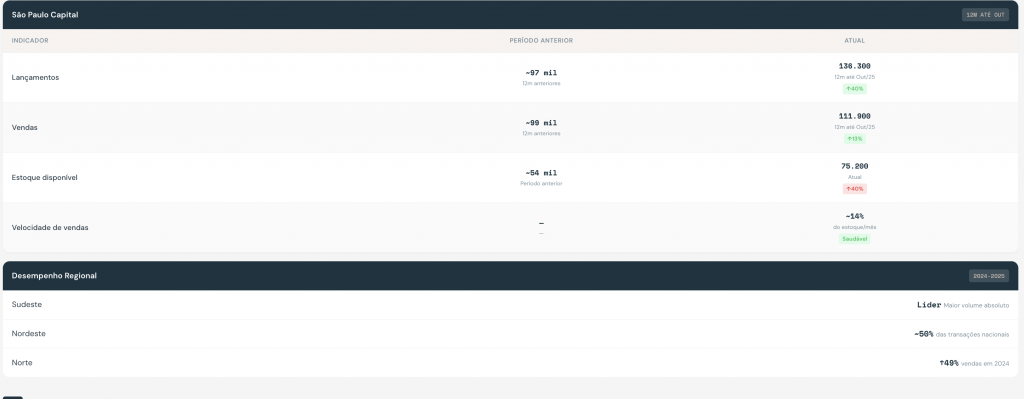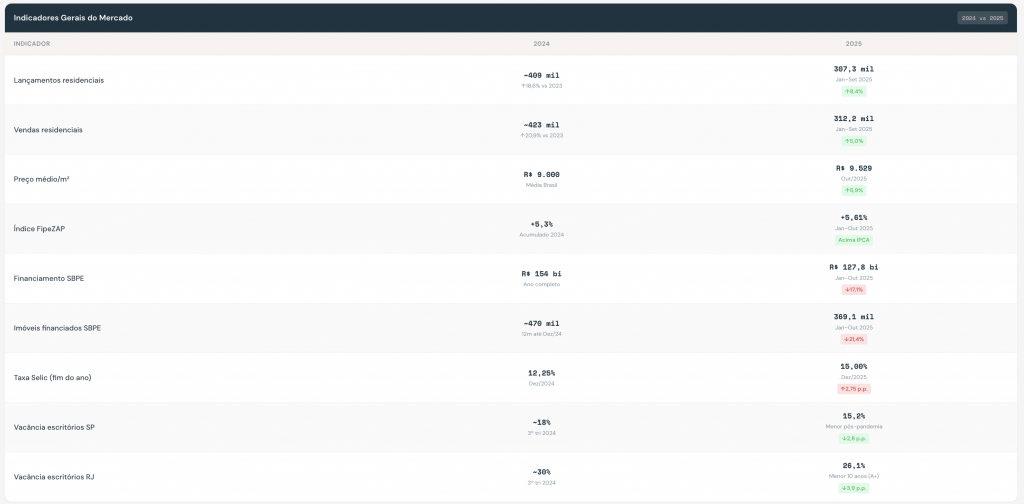 O mercado imobiliário brasileiro manteve resiliência em 2025 mesmo com Selic em 15% a.a. O segmento popular (MCMV) foi o grande motor, respondendo por 67% das vendas em São Paulo. Crédito SBPE retraiu 17%, mas funding FGTS compensou parcialmente. Vacância de escritórios em SP atingiu 15,2%, menor nível pós-pandemia.
