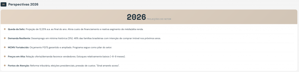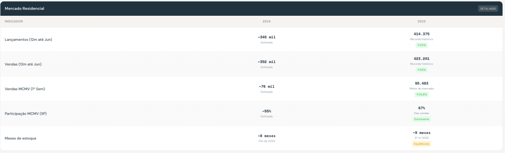 O segmento popular dominou 2025. Quase 50% dos lançamentos foram enquadrados no MCMV. Vendas pelo programa saltaram 25,8% no 1º semestre. Médio e alto padrão operaram em ritmo mais moderado devido aos juros elevados.